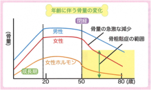 この図のように、骨量が増えるのは成長期であり、最大骨量は成長期で決まると言われています。また女性は、閉経後から女性ホルモン減少の影響により、骨粗鬆症のリスクが高まると言われています。そのため、成長期にから骨粗鬆症の予防は始まっています!