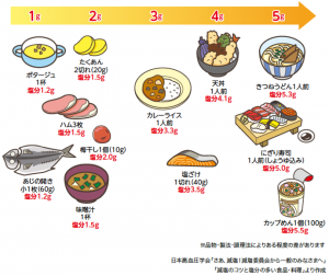 図を見てわかるように、うどんやラーメンには多くの塩分が含まれています。汁を全て飲み干してしまうと1日の目標量の半分以上の塩分を摂取することになるので注意が必要です。