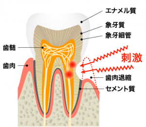 私たちが一般的にいう知覚過敏とは「象牙質過敏症」です。う蝕や歯髄炎などがないのに、冷たいもや熱いものを口にしたとき、風が当たった時、ブラッシング時などにしみて、一過性の痛みを感じます。原因としては、強いブラシングや歯周病などで歯肉が退縮して象牙質が露出したり、歯ぎしりなどが歯にひびが入ったりすることなどが挙げられます